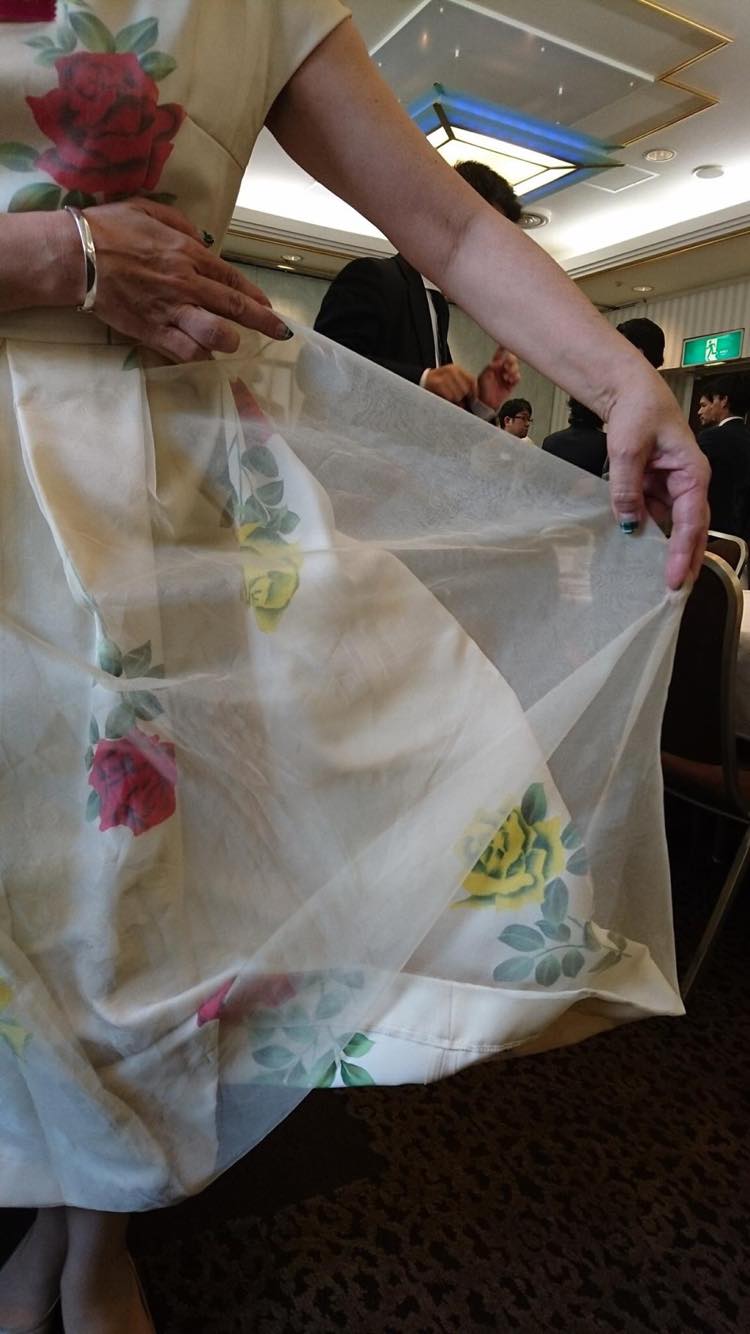 古い着物の汚れと弱さをカバーしてくれるシルクオーガンジーを被せた、うちではよくやるパターンですが、生地に陰影が出て、高級感も出ます。オーガンジーの色を変えると、玉虫色に変化したりします。