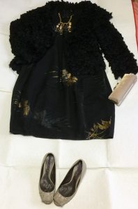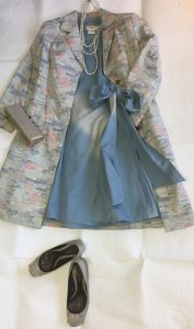 シルクウールのジャガード織りのシュートジャケットと、黒の四角い布を、接ぎ合わせた、フレアスカート。 色を抑えめで、ブローチと、バッグを、合わせて、素敵な組み合わせでしょう。 抑えめな色の組み合わせの場合、アクセサリーも、…