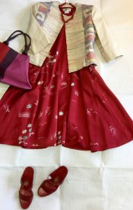 赤いワンピースと、白いボレロ、なんだかおめでたい色合わせですが、、、笑。 名古屋帯の、ボレロは、何時も存在感たっぷりで、一つ持っていると、便利です。 赤いろうけつ染の、ワンピースは、とても可愛い柄で、人気のテントシルエッ…