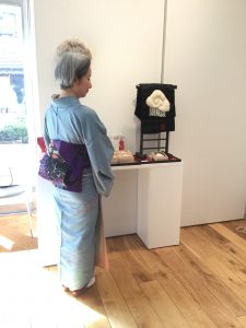 今回も何回かお着物で会場に居ましたので、その時の画像アップして見ますね。 この日のお着物は、今回の五月雨展にはぴったりの色と、柄でした。 綺麗なブルーに臙脂色で、波紋の柄が所々に織り込まれています。 多分紬なのでしょうが…