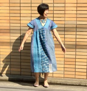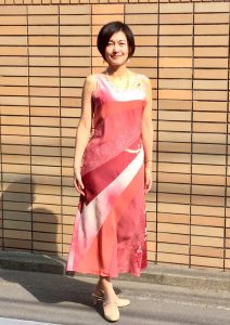 斜めはぎのロングドレス、甘くピンクでまとめてみました。 斜めといってもアンバランスに左ウエストから、円を描くように上から下へ広がる斜めラインのパッチワークドレスです。この接ぎ方は、着た時にウエストを細く見せてくれるだけで…