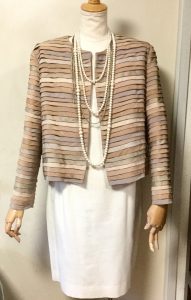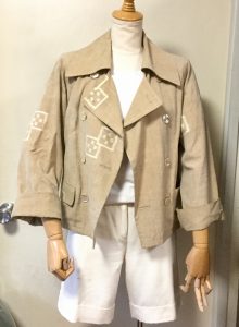 このジャケット、ゆったりたっぷりざっくりの、気楽なジャケットなんです。 でも、これで、仕事にも行け、遊びにも行ける重宝なジャケットです。 ベージュの紬って、中々無くて、最初はこの白い柄が気になってしょうがなかったのですが…