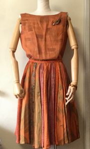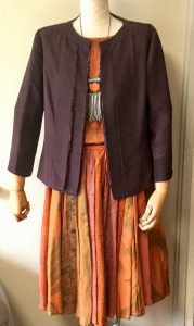 オレンジに見える紬で、ツーピース❣️ 元々は上に関しては、ハーフコートでした。 ラインがもう古く、ほとんど着ないまま、箪笥の肥やし状態でした。 それで、私のワードロープの中で、1番出番の多い形のジャケットに作り変えました…