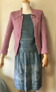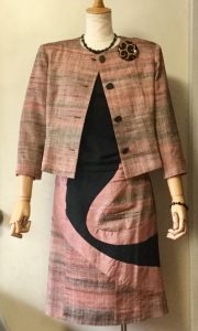 昨日の究極のコーディネートに、紫の帯のジャケットを合わせて見ました。 この紫の名古屋帯には、御所人形の絵が書かれて居ましたが、その部分は、使わず、無地に所のみで、ジャケットを作ってみました。前のところのプリーツには、他素…