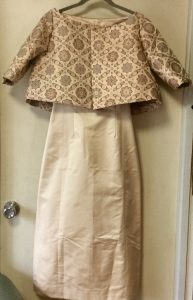 一本の帯、狭くて、短くて、、、とお思いでしょうが、、、これだけのものが出来上がります。 金糸銀糸の織り柄の部分で、ボレロを作り、裏の無地のところを使って、ドレスを作りました。 如何でしょうか❓これだけの分量あるのかと、び…