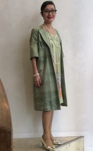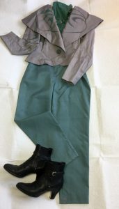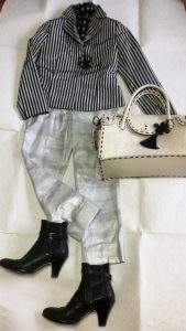 シルクウールのジャガード織りのシュートジャケットと、黒の四角い布を、接ぎ合わせた、フレアスカート。 色を抑えめで、ブローチと、バッグを、合わせて、素敵な組み合わせでしょう。 抑えめな色の組み合わせの場合、アクセサリーも、…