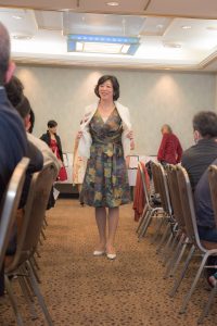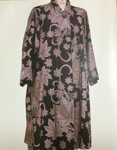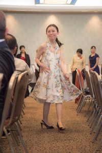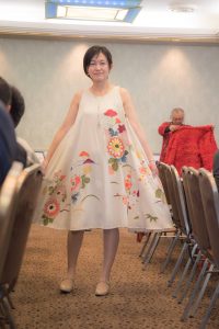 先日の朝会でのミニファッションショーの続きです。 白地に色々な柄の羽織でした。ホルターネックのテントシルエットのワンピースです。 ホルターネック、という事は背中は、何も無し、首に引っ掛けて着ているということになります。 …